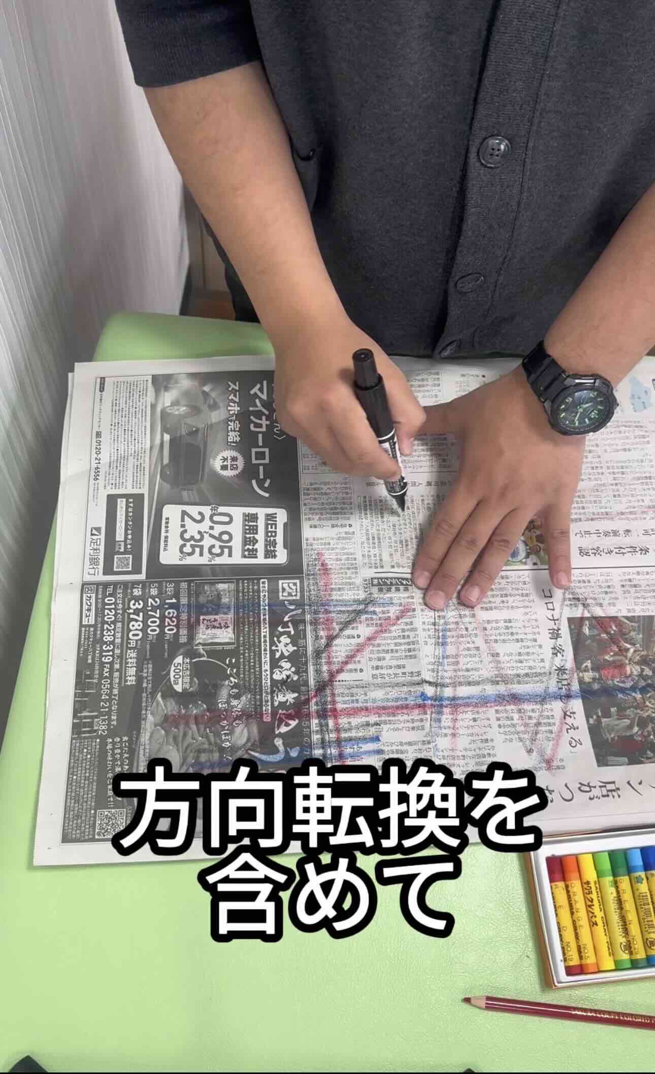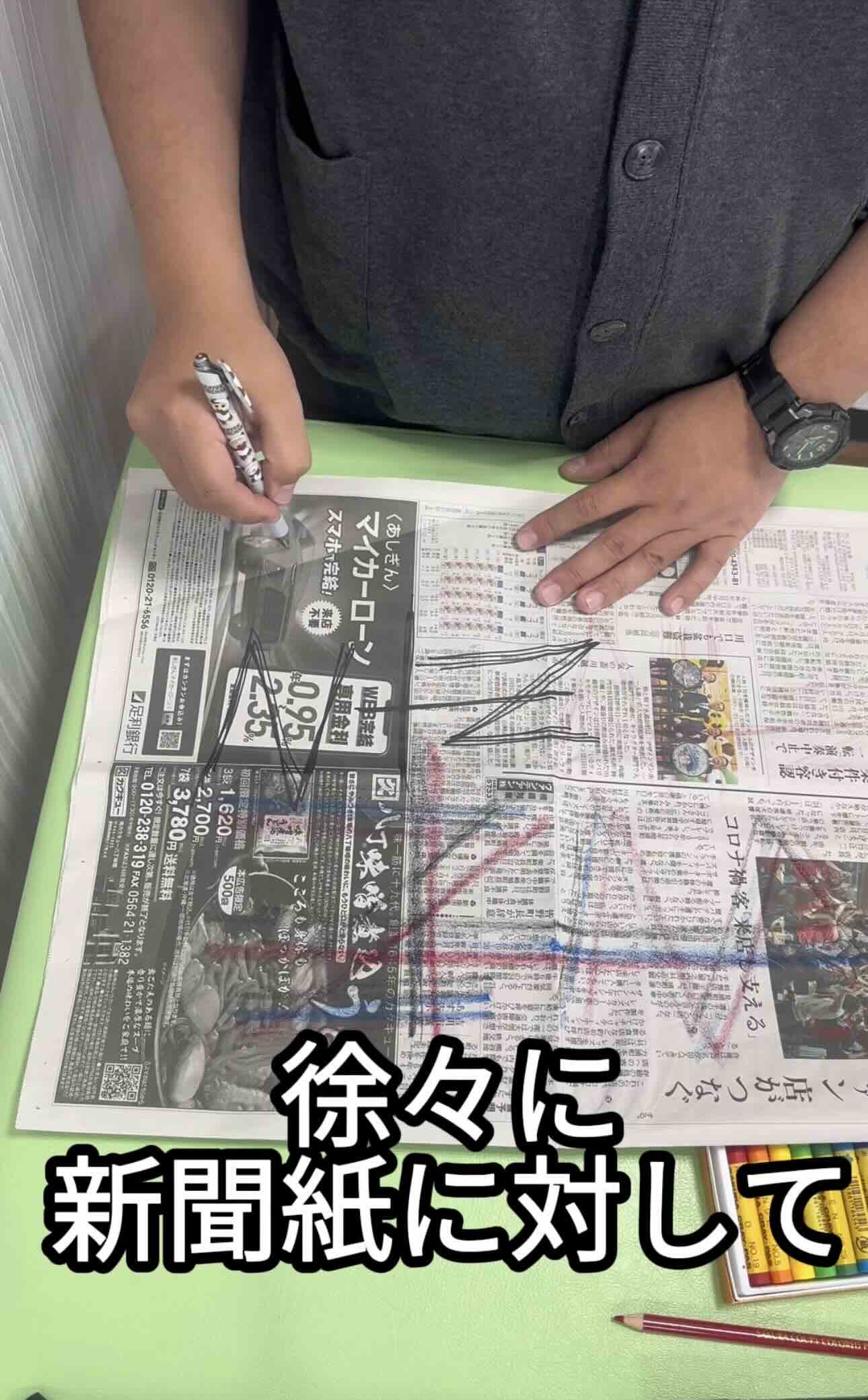 ・使用道具:新聞紙、クレヨンor鉛筆(色鉛筆)or油性ペンorボールペン